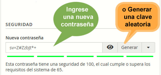 Para asignar la nueva contraseña a la cuenta de correo electrónico debe ir al campo Seguridad > Nueva contraseña. Asegúrate de crear una contraseña segura que combine letras, números y símbolos para aumentar la seguridad.