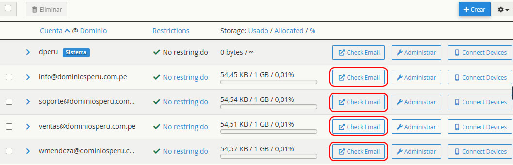 Ahora verás un listado con todas las cuentas de correo asociadas a tu dominio. Pulsa sobre el botón «Check email» correspondiente a la dirección de email de la que quieres consultar tu correo.