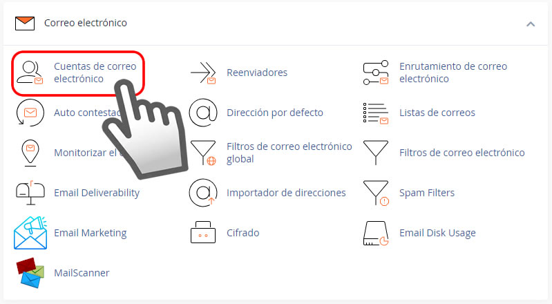 Accede a cPanel y, en la sección «Correo electrónico», pulsa sobre «Cuentas de correo electrónico».